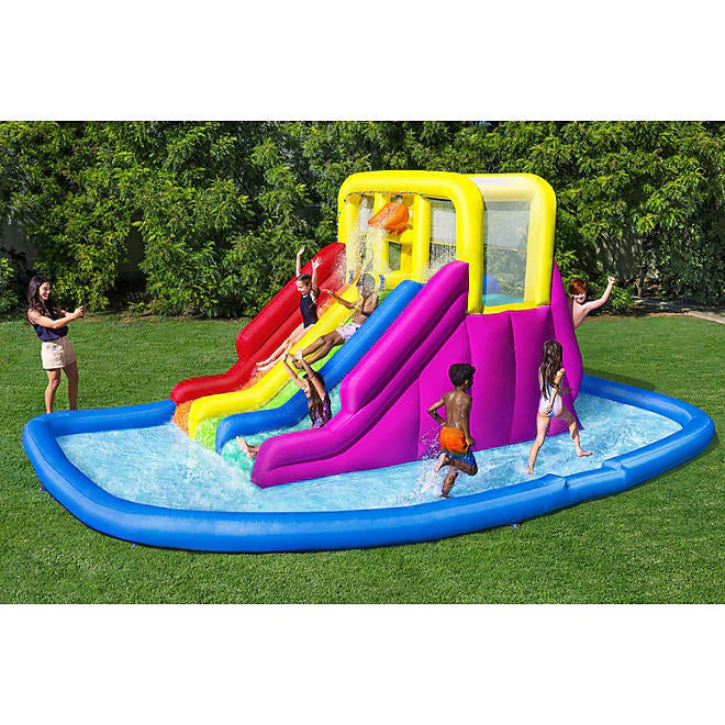A huge inflatable pool surrounded by three slides,the Mega Water Park is the ultimate backyard accessory. This water park can host up to nine kids for a splash-filled day outdoors. Friends can race up the triple climbing wall, which features individual padded handles and footholds for safety. At the mesh tower peak, three different slides offer three fun ways to splash down, each with a unique adventure. Slide one is equipped with a water sprayer for showers of fun, slide two features a spontaneous dump bucket and slide three has a wall of water to venture through. Kids can take turns trying each slide as they race to the bottom for a huge splash in the pool for triple the summer fun.